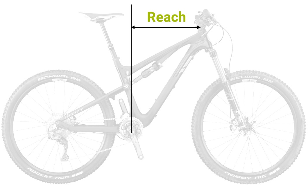 | Als Reach bezeichnet man den horizontalen Abstand der vertikal verlängerten Tretlagermitte bis zur Oberkante des Steuerrohrs. |