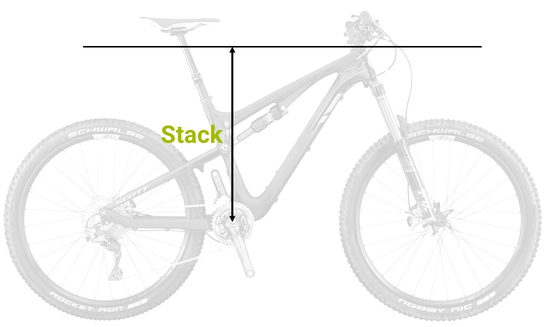 | Als Stack bezeichnet man den vertikalen Abstand der Mitte des Tretlagers bis zur horizontal verlängerten Oberkante des Steuerrohrs. |