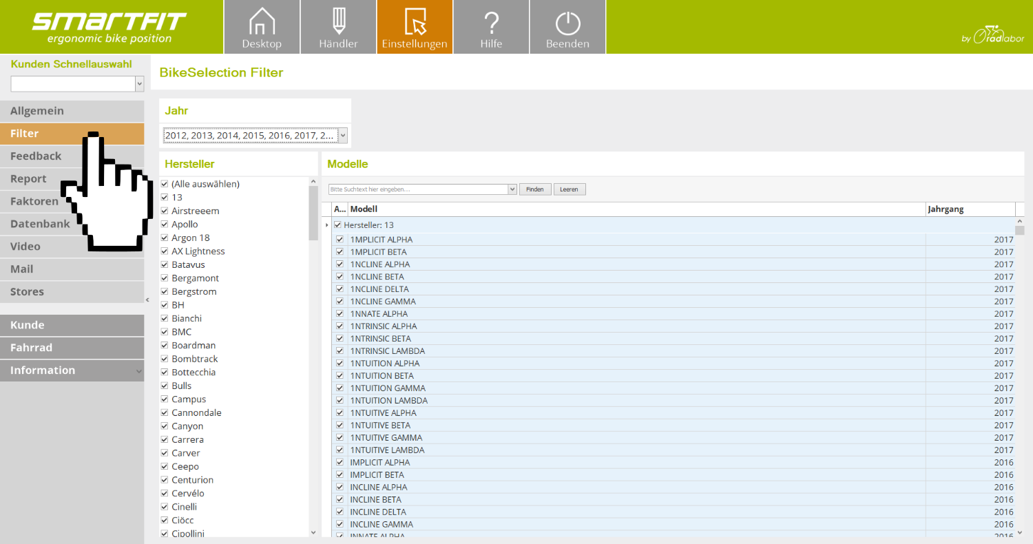 Über die Einstellungen unter legen Sie fest, welche Radmarken in der BikeSelection zu finden sind. Löschen Sie einfach den Haken bei den Marken, die Sie nicht in der BikeSelection sehen möchten. Auch einzelne Modelle einer Marke lassen sich herausfiltern.