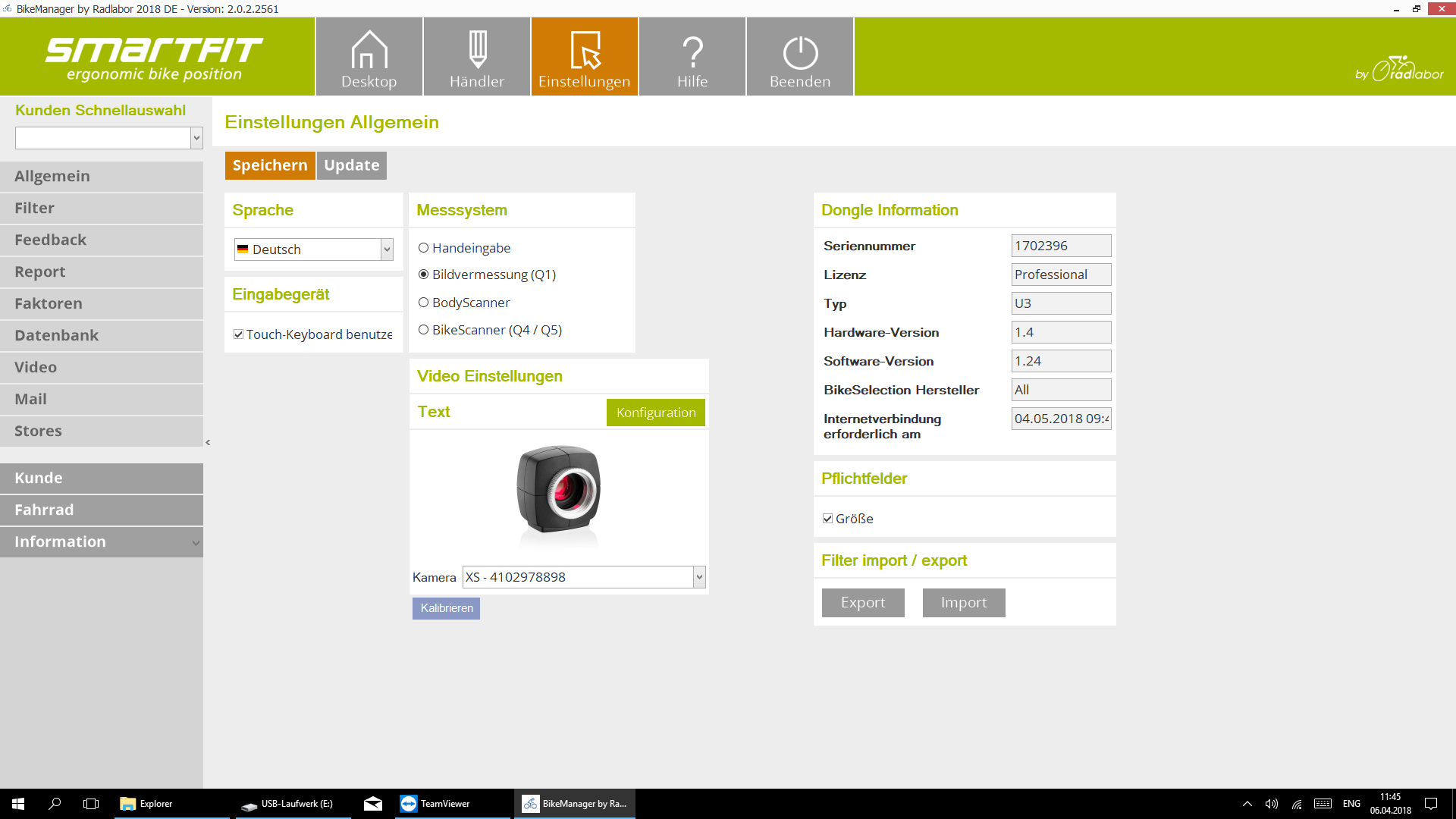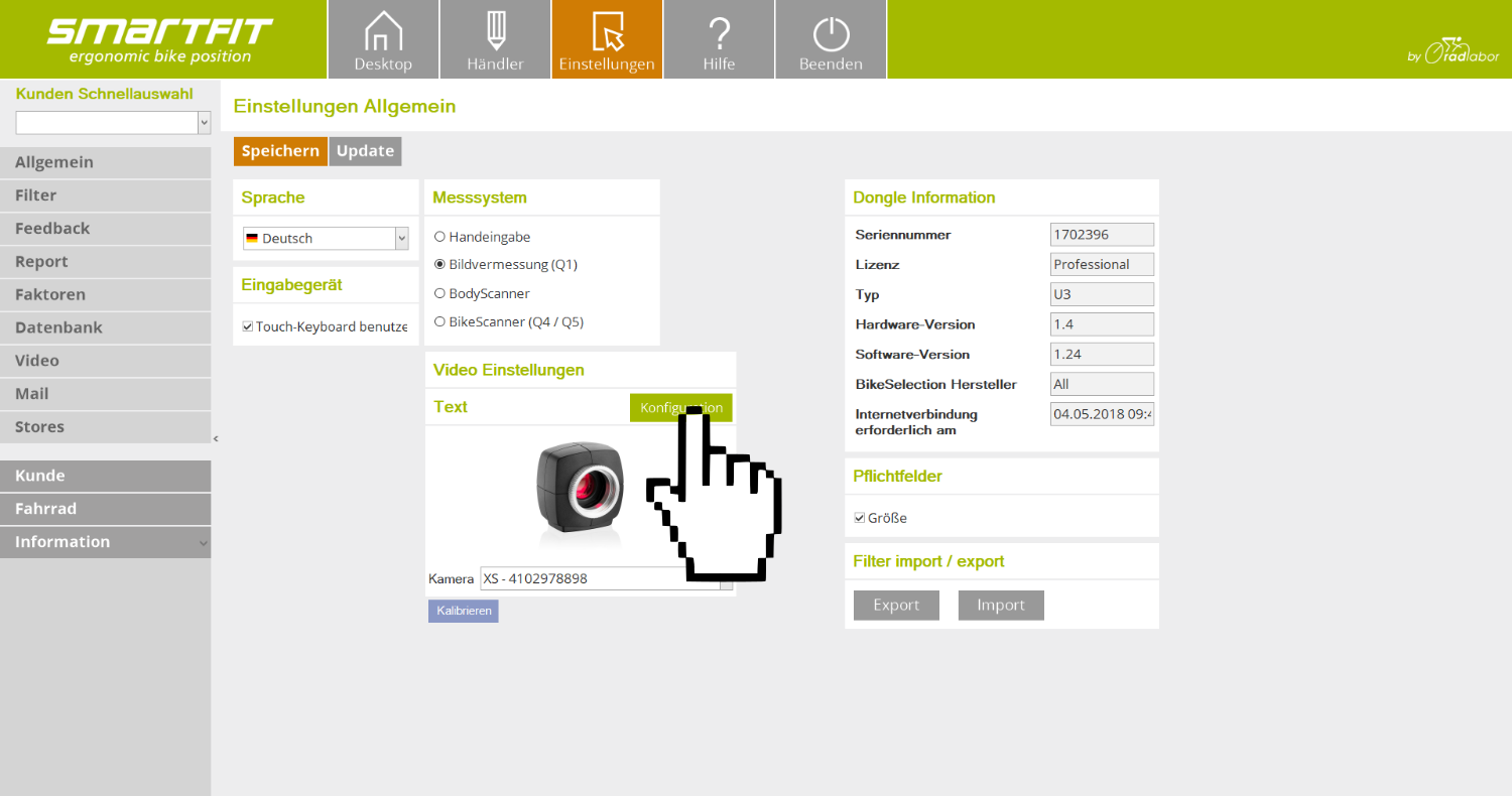 In den allgemeinen Einstellungen können Sie die Spracheinstellungen, das ausgewählte Messystem, die Dongle-Information sowie die Konfiguration und Kalibrierung der Kamera vornehmen.