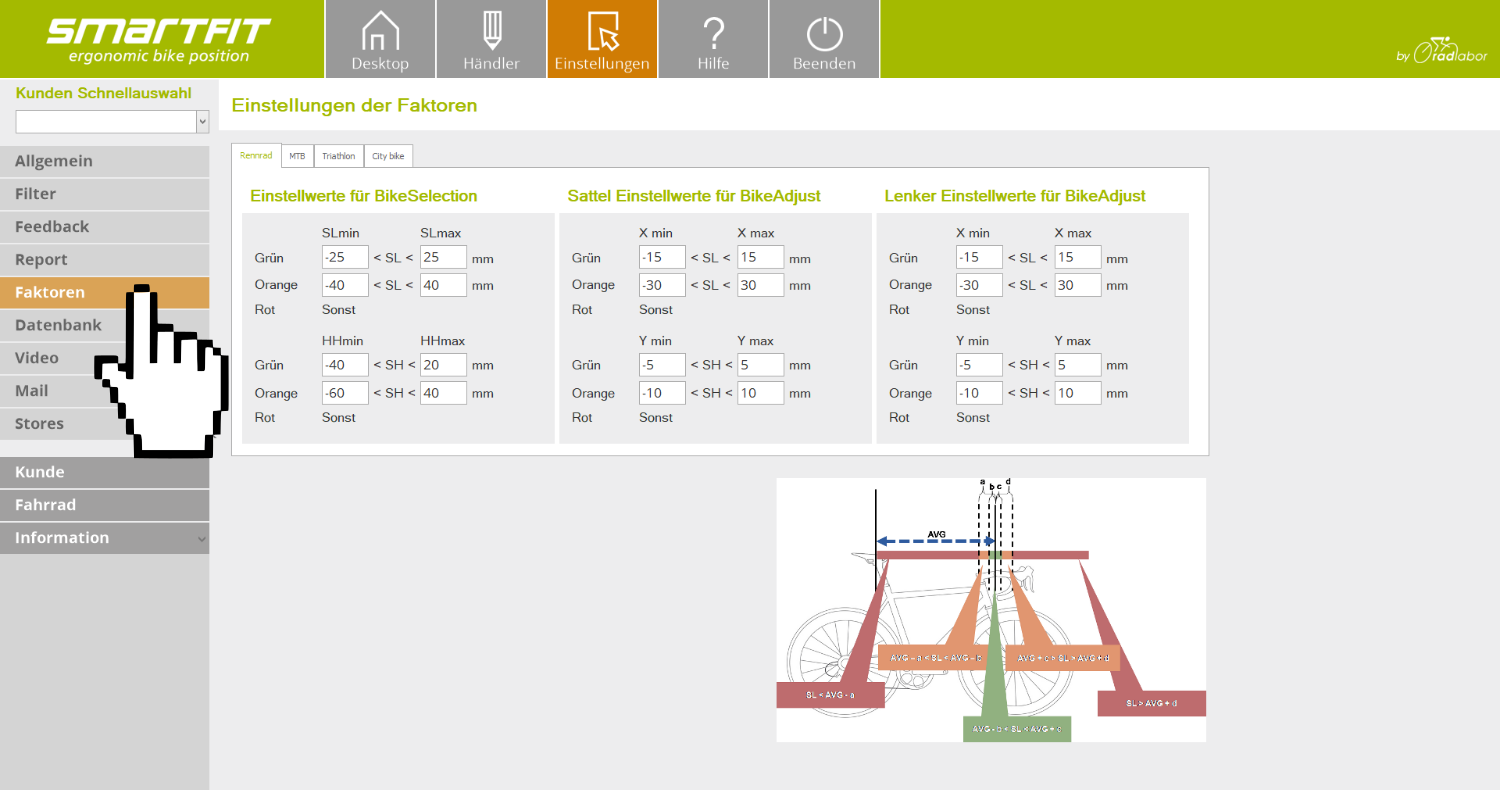 Hier können Sie die Berechnungseinstellungen des Programmes ändern: Sie können den grünen / gelben / roten "Bereich" der BikeSelection und des BikeAdjust verkleinern oder vergrößern. Sollen mehr Fahrräder im grünen Bereich angezeigt werden, vergrößern Sie einfach die Spanne. Sollen weniger Räder angezeigt werden, verkleinern Sie die Spannweite.