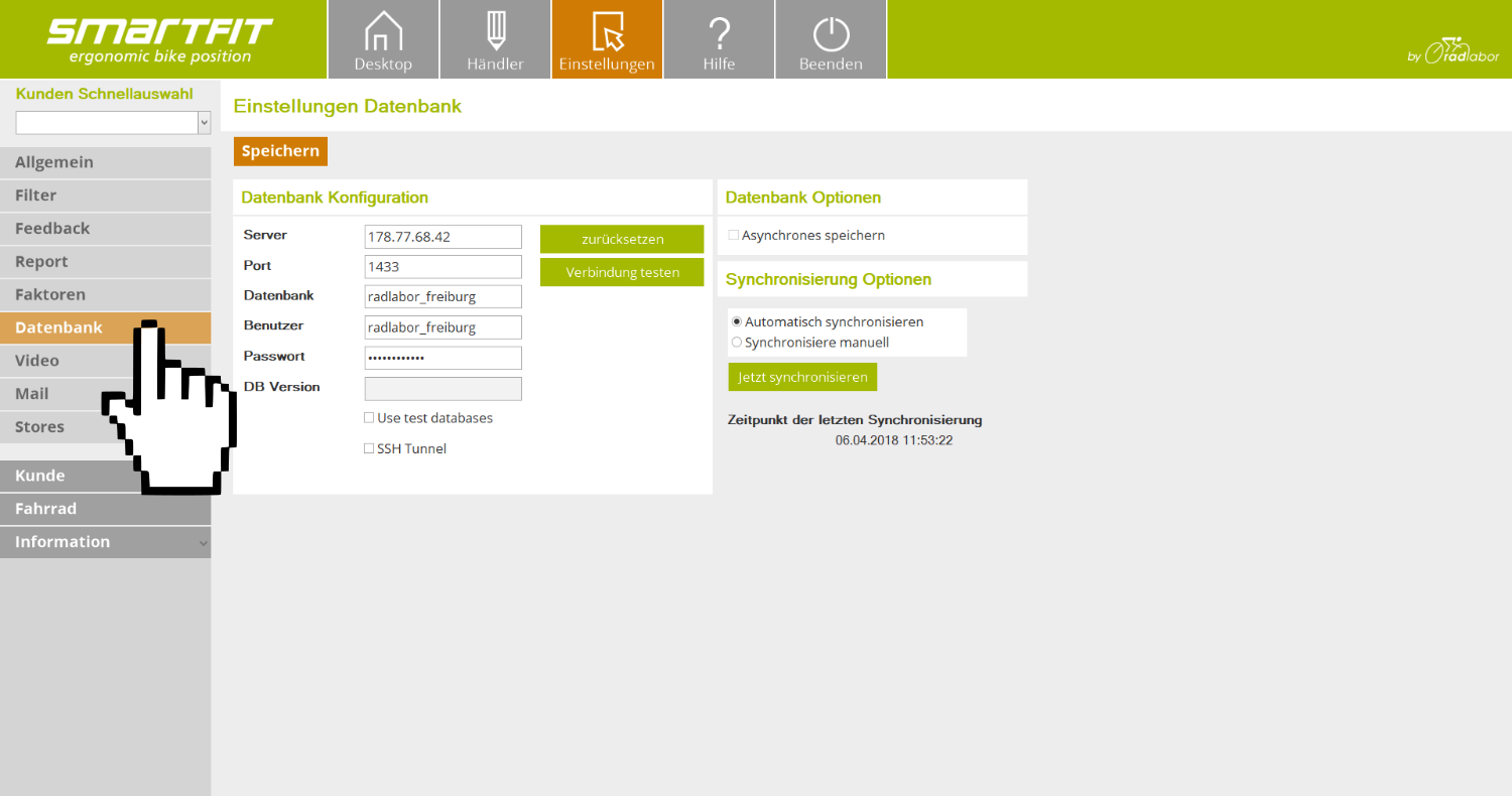 Hier finden Sie die Einstellungen zur Datenbank und zur Synchronisierung. Wir empfehlen Ihnen, die Standardeinstellungen beizubehalten. Tippen Sie auf "Verbindung testen", um zu überprüfen, ob Ihre Datenbankverknüpfung funktioniert.