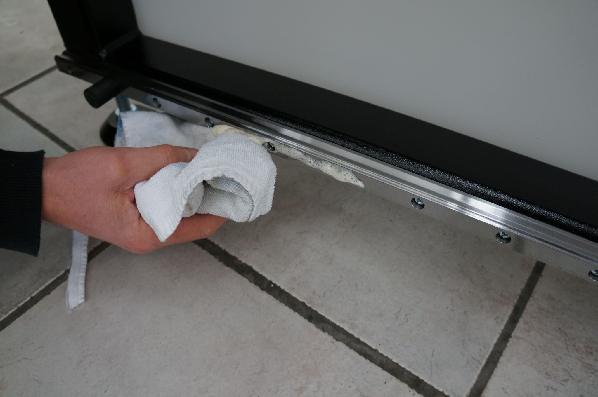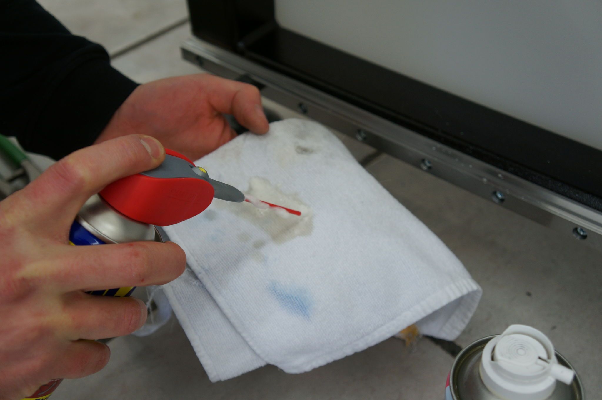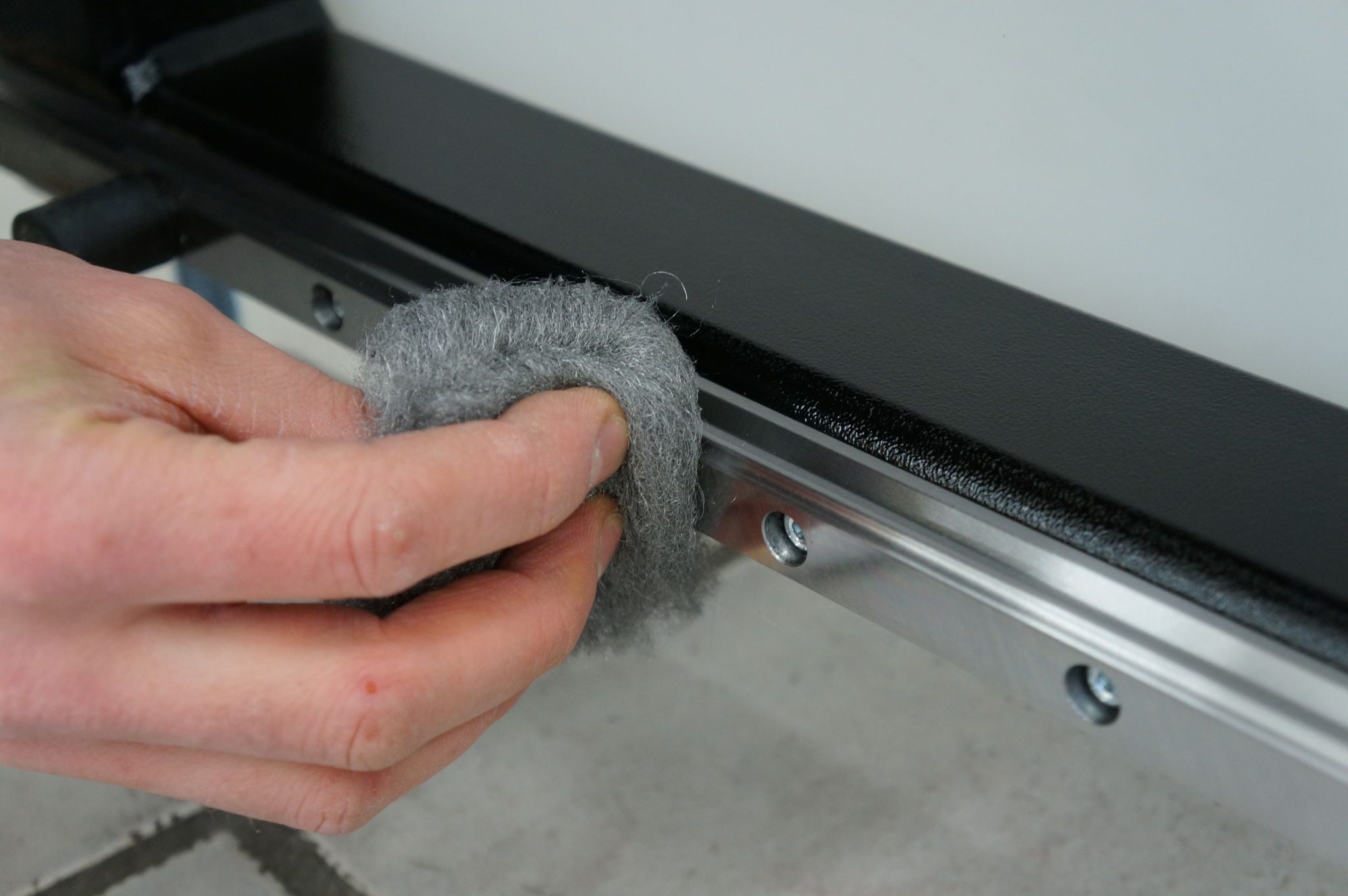 Entfernen Sie grobe Schmutzpartikel und reinigen Sie anschließend die Schienen mit einem Universalspray. |