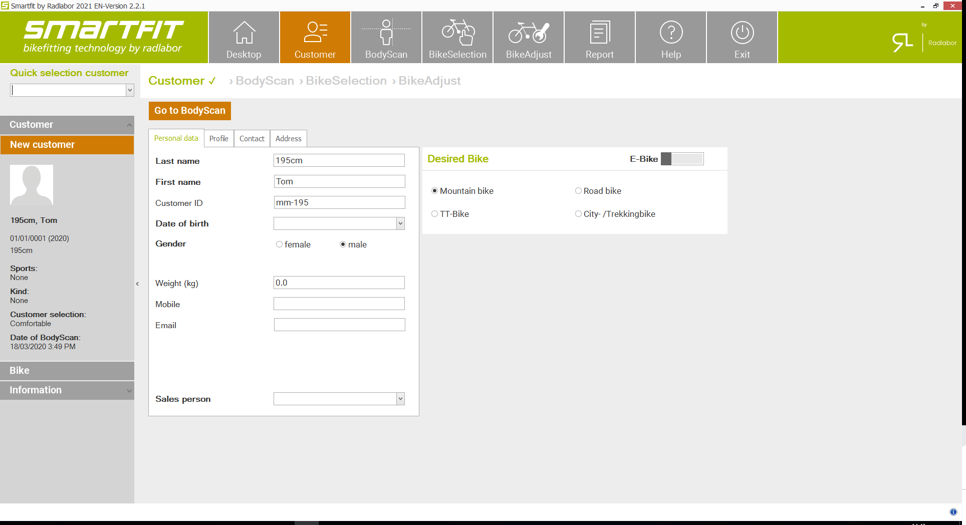 Übrigens, wir haben Ihnen eine Auswahl unterschiedlich großer Musterkunden in Ihrer Datenbank hinterlegt. Diese können Sie nutzen, um mit Standard-Körpermaßen in der Software die Radauswahl und Dateninterpretation zu üben. Die Musterkunden tauchen ganz oben in der Schnellauswahl-Liste auf. Weitere Erklärungen zu den Musterkunden finden Sie hier »