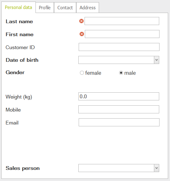 | Geben Sie hier den Nachnamen und Vornamen des Kunden ein (Pflichtfelder). Die restlichen Felder sind optional. Für Rückfragen oder weiteren Service kann es hilfreich sein, Kontaktinformationen Ihrer Kunden zu sammeln. Sie können den Kunden einem Verkäufer zuordnen (Sales person). |