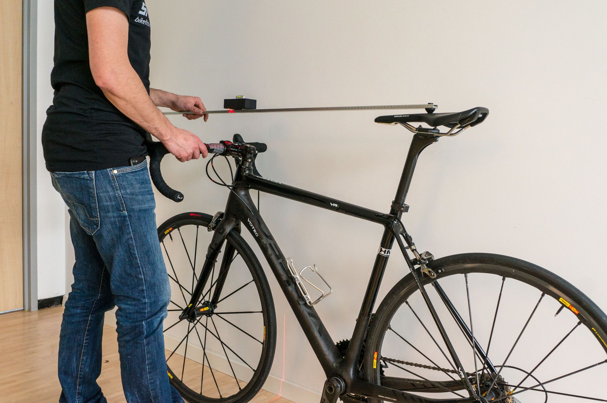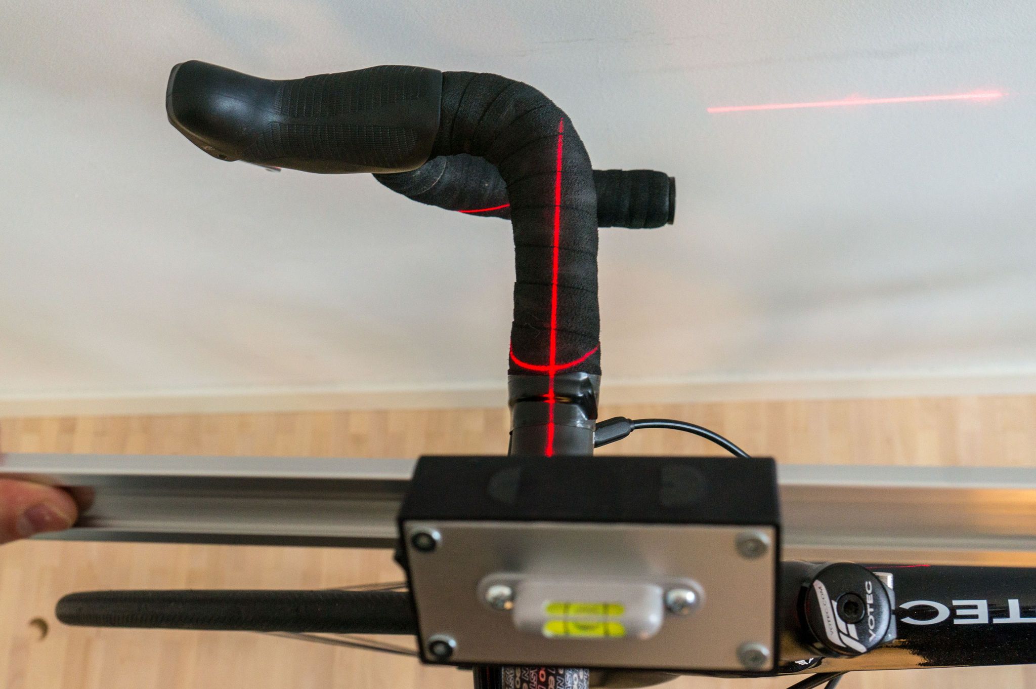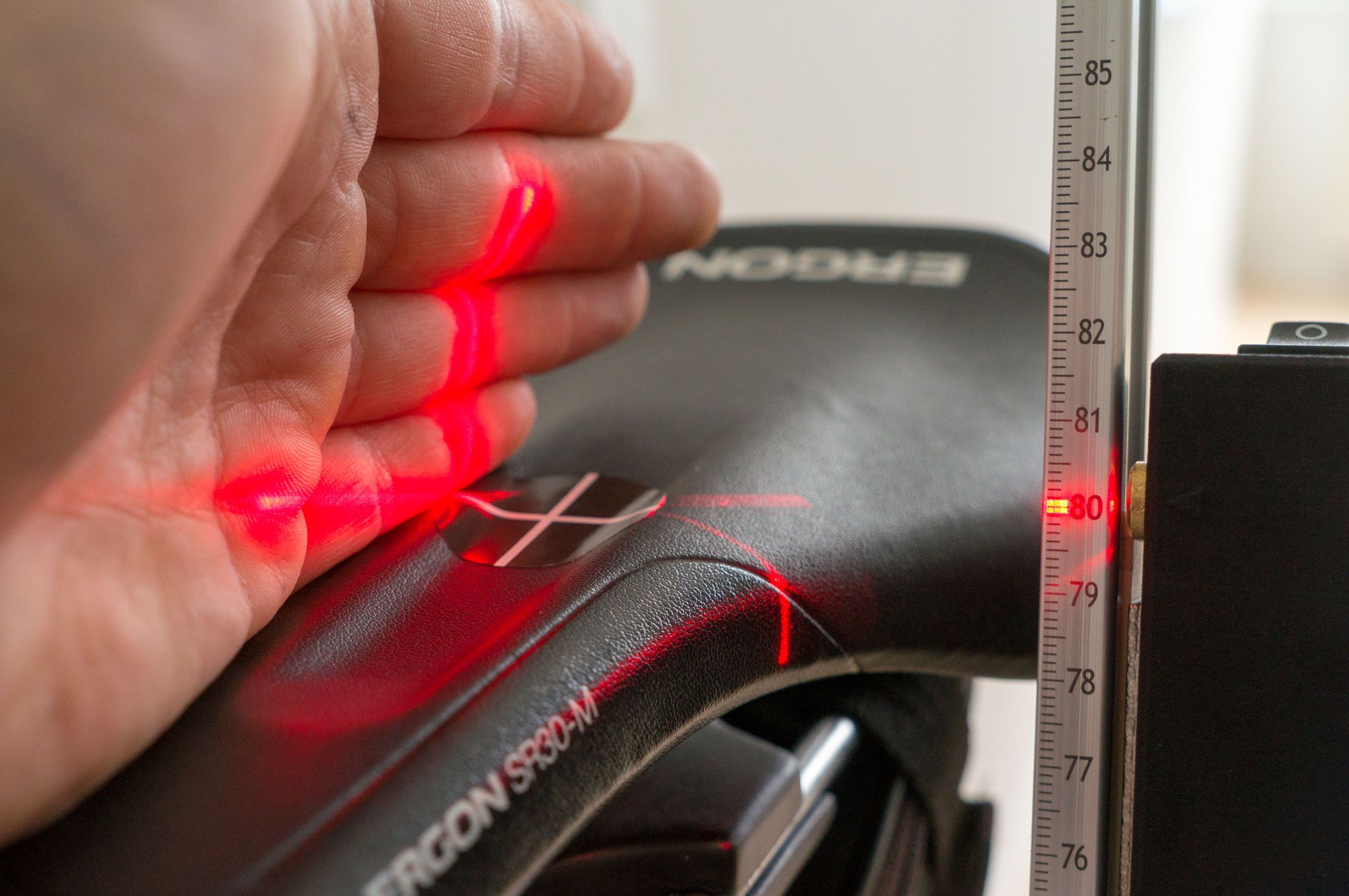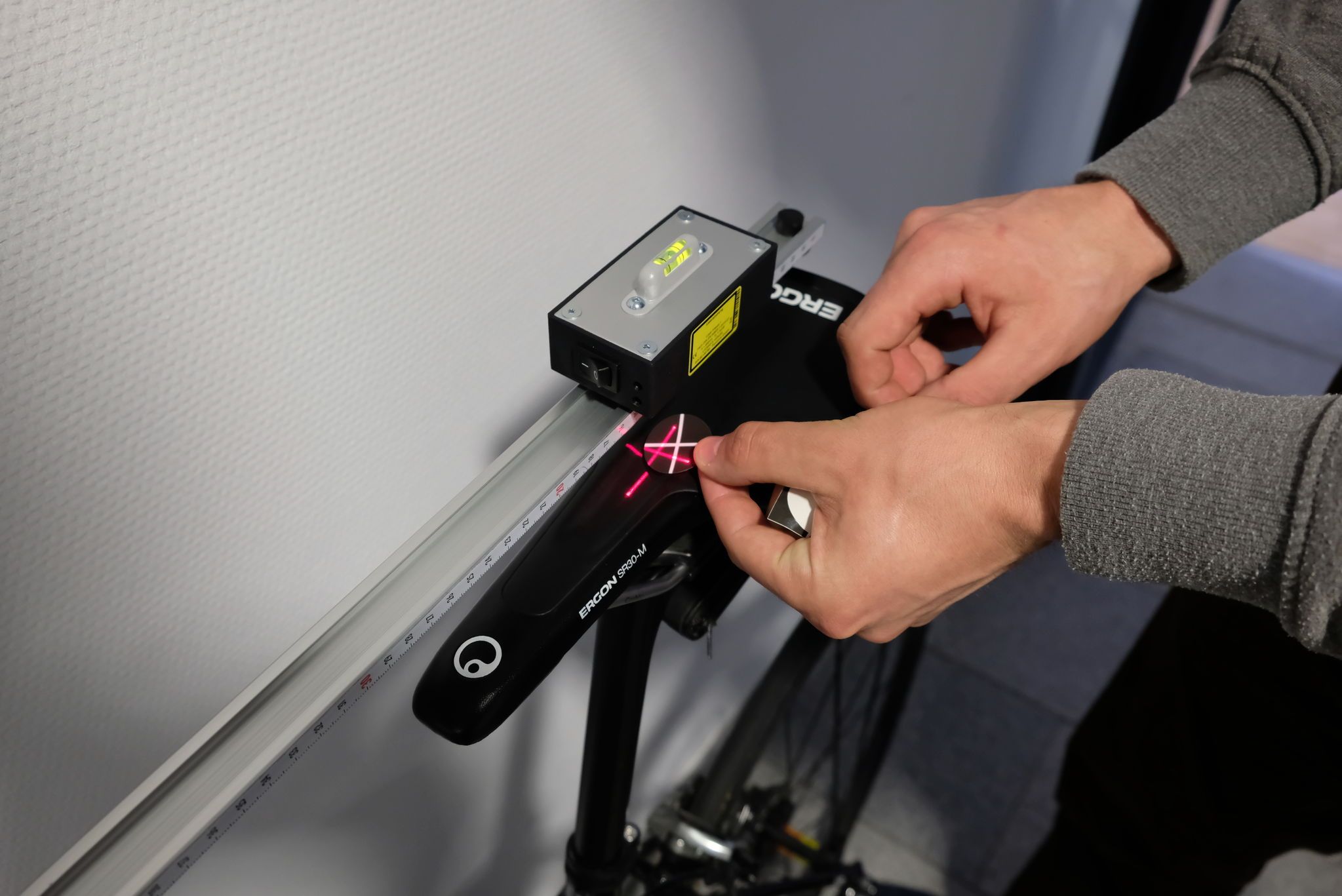 | Durch leichtes Kippen des Lasers überprüfen Sie nun, ob die Griffflächen des Lenkers mit der eingestellten Sitzlänge übereinstimmen. In unserem Beispiel ist der Lenker zu weit vorne.
