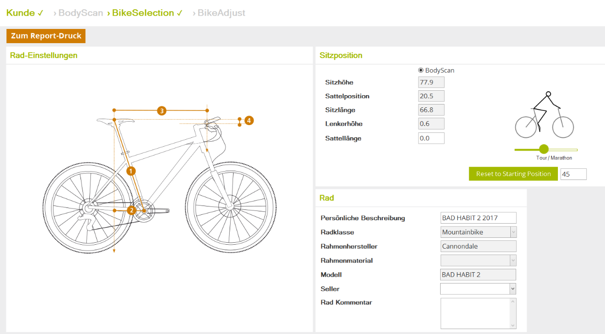 Ihr Q1 errechnet auf Basis der Messwerte des BodyScans korrekte und präzise Empfehlungen, nach denen Sie das Fahrrad eines Kunden einstellen können. Die vier Maße, die Sie auf ein Fahrrad übertragen können, lauten wie folgt: