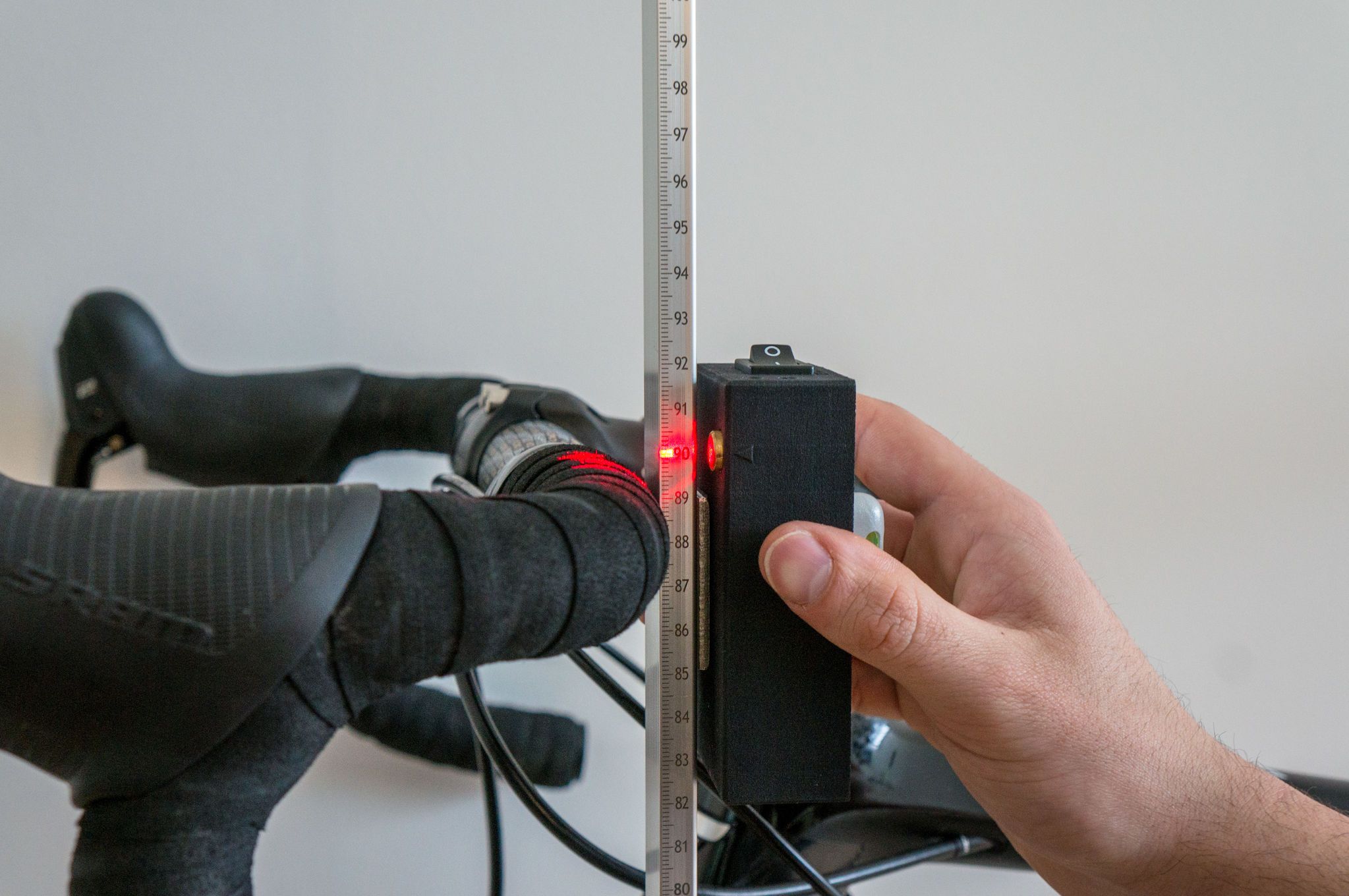 | Im letzten Schritt wird das Lasermeter auf den Boden gestellt, um die Lenkerhöhe einzustellen.
