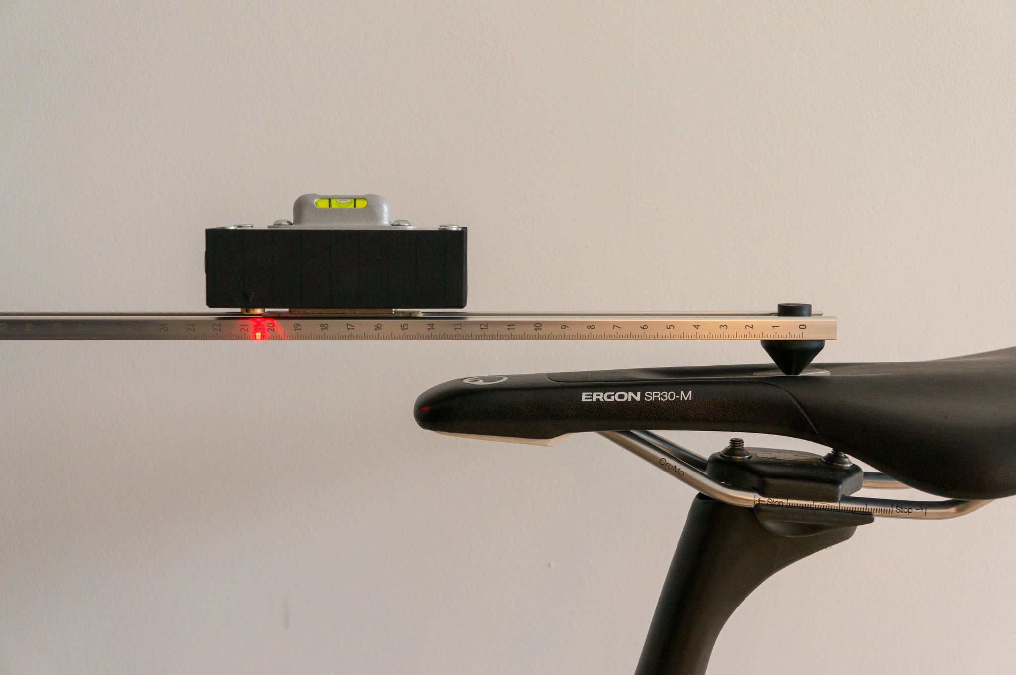 | Dann wird das Lasermeter wieder mit dem Kegel an der Sattelmitte angelegt. Achten Sie mithilfe der Wasserwaage darauf, dass das Lasermeter waagrecht liegt. |